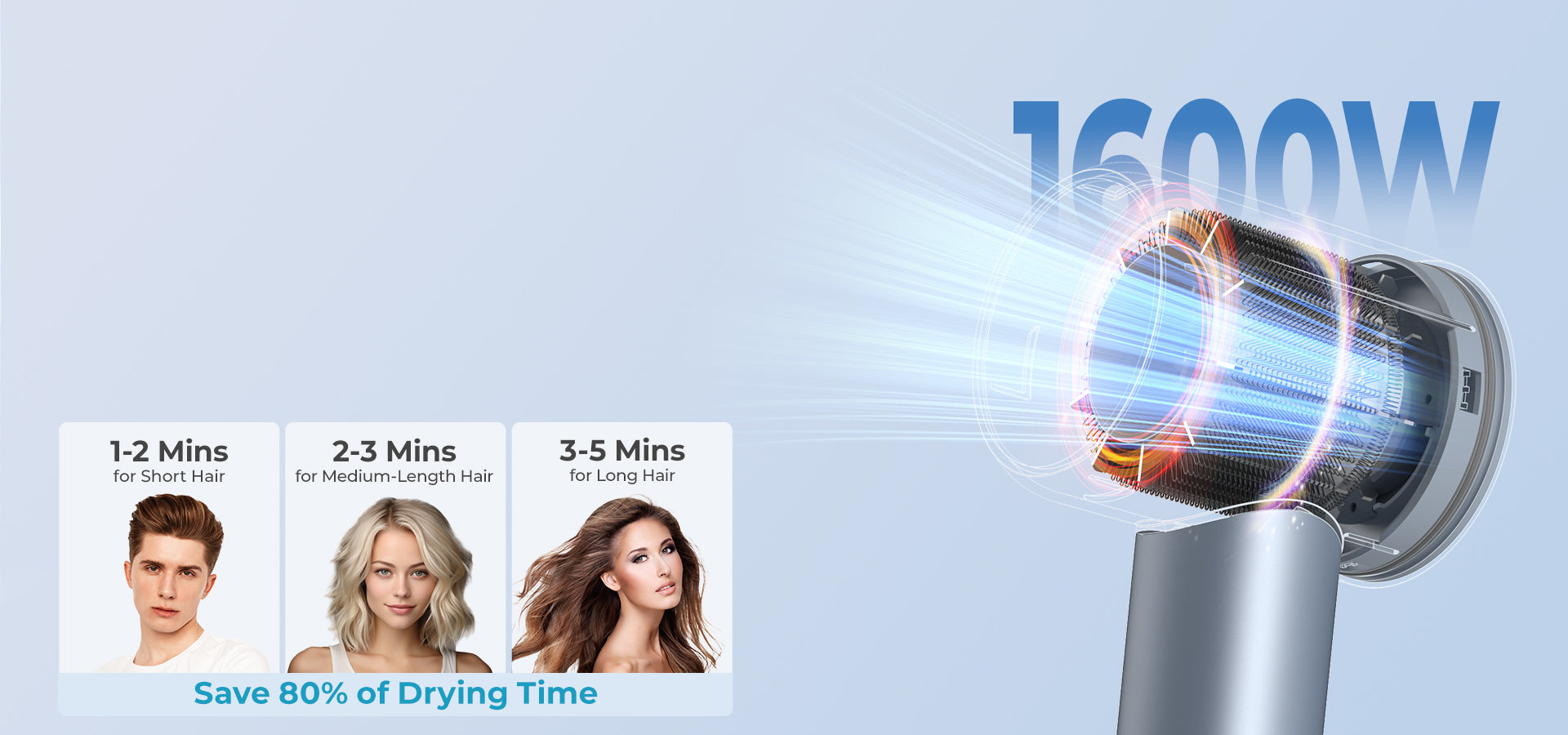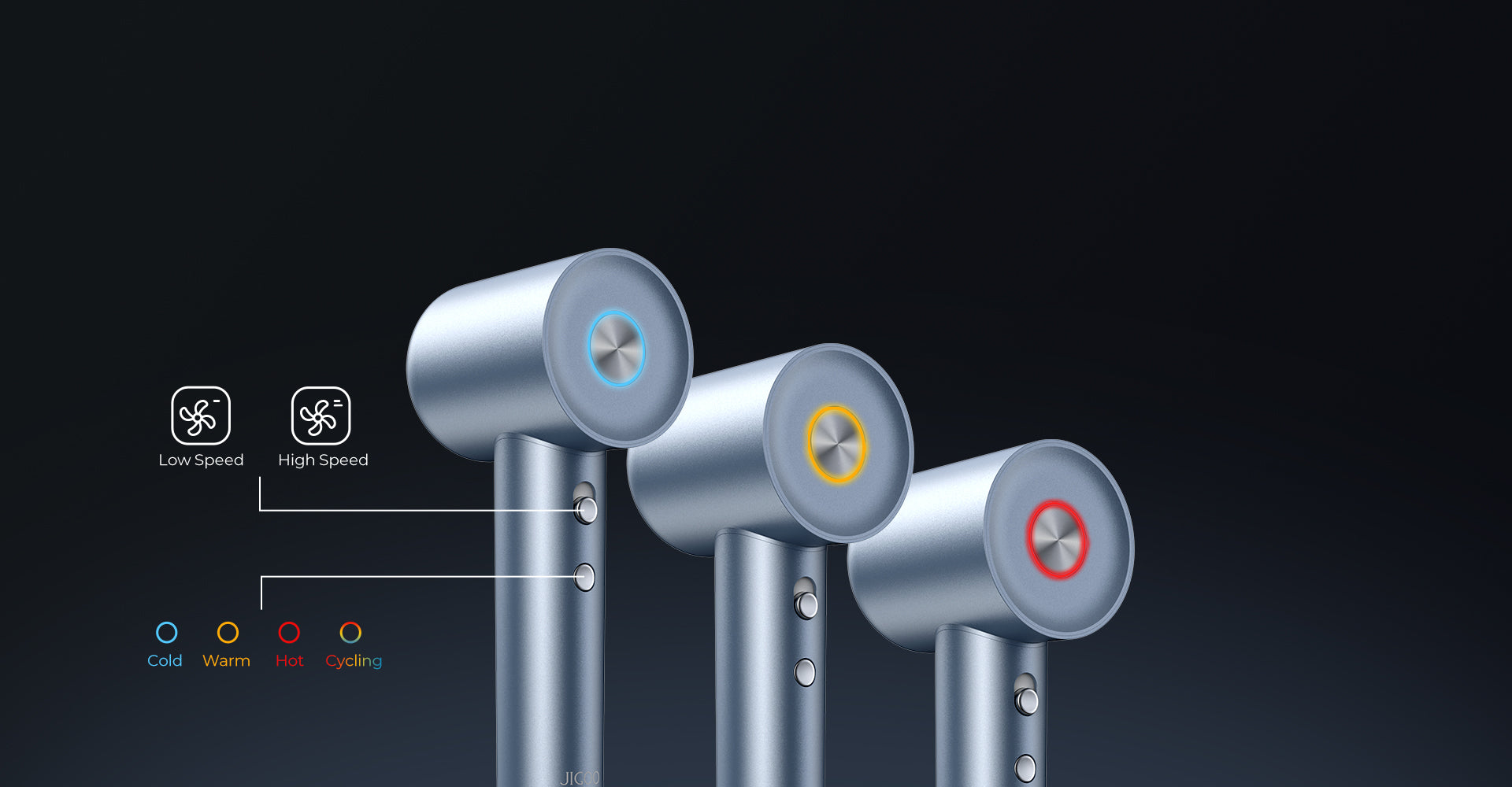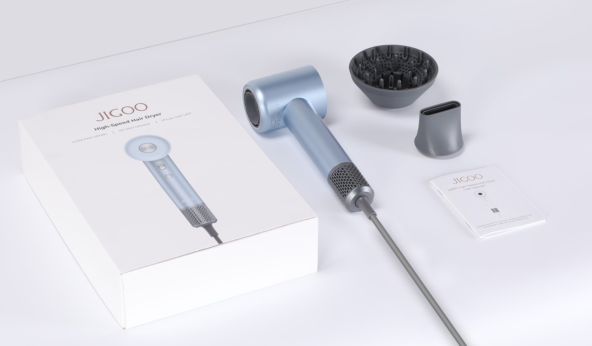 Im Vergleich zu herkömmlichen Haartrocknern verfügt der JIGOO H300 über einen bürstenlosen Motor mit einer ultrahohen Geschwindigkeit von 110.000 U/min, der einen stärkeren Luftstrom von 22 m/s für schnelleres Trocknen liefert. Dank der höheren Trocknungseffizienz trocknet der H300 Ihr Haar bei niedrigerer Temperatur und verhindert so, dass es trocken, kraus und stumpf wird. Darüber hinaus besticht der H300 durch sein leichtes, kompaktes Design und liegt somit mühelos in der Hand.