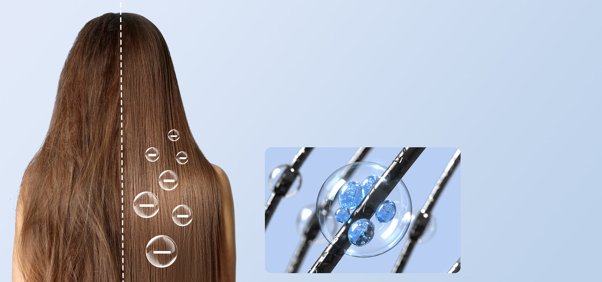 Der Ionen-Haartrockner gibt 200 Millionen negative Ionen ab, die den positiven Ionen im nassen Haar entgegenwirken. Dadurch werden statische Elektrizität und Frizz beseitigt und die Schuppenschicht des Haarschafts versiegelt, was zu glatterem und glänzenderem Haar führt.