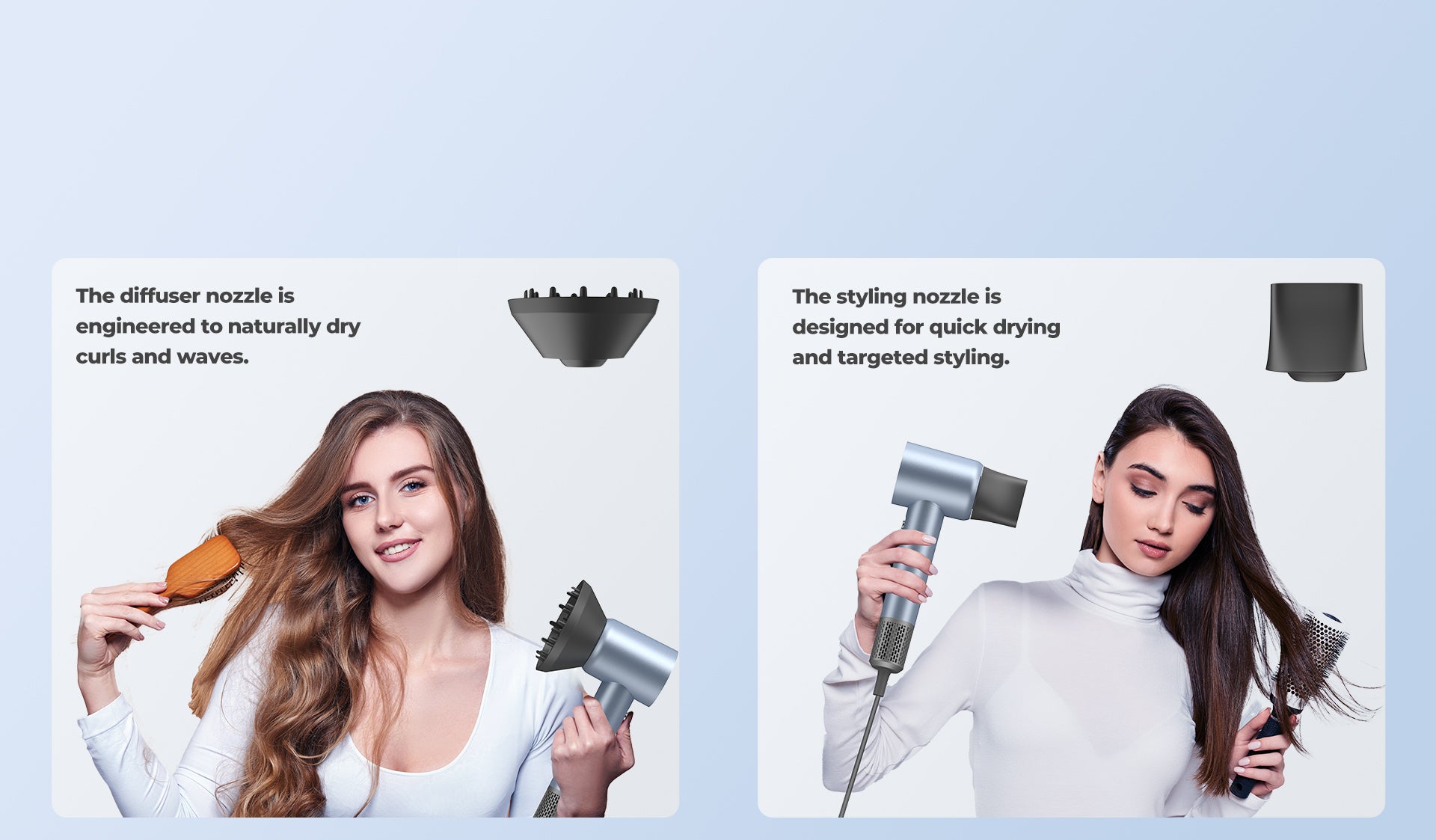 Der H300 Haartrockner verfügt über Styling- und Diffusordüsen für optimales Haarstyling. Die Stylingdüse fokussiert den Luftstrom für gezielteres Trocknen, während die Diffusordüse Locken und Wellen durch sanfte Luftverteilung trocknet und definiert. Dank des magnetischen Designs lassen sich die Düsen einfach anbringen und die Luftstromrichtung durch Drehen der Stylingdüse flexibel anpassen.