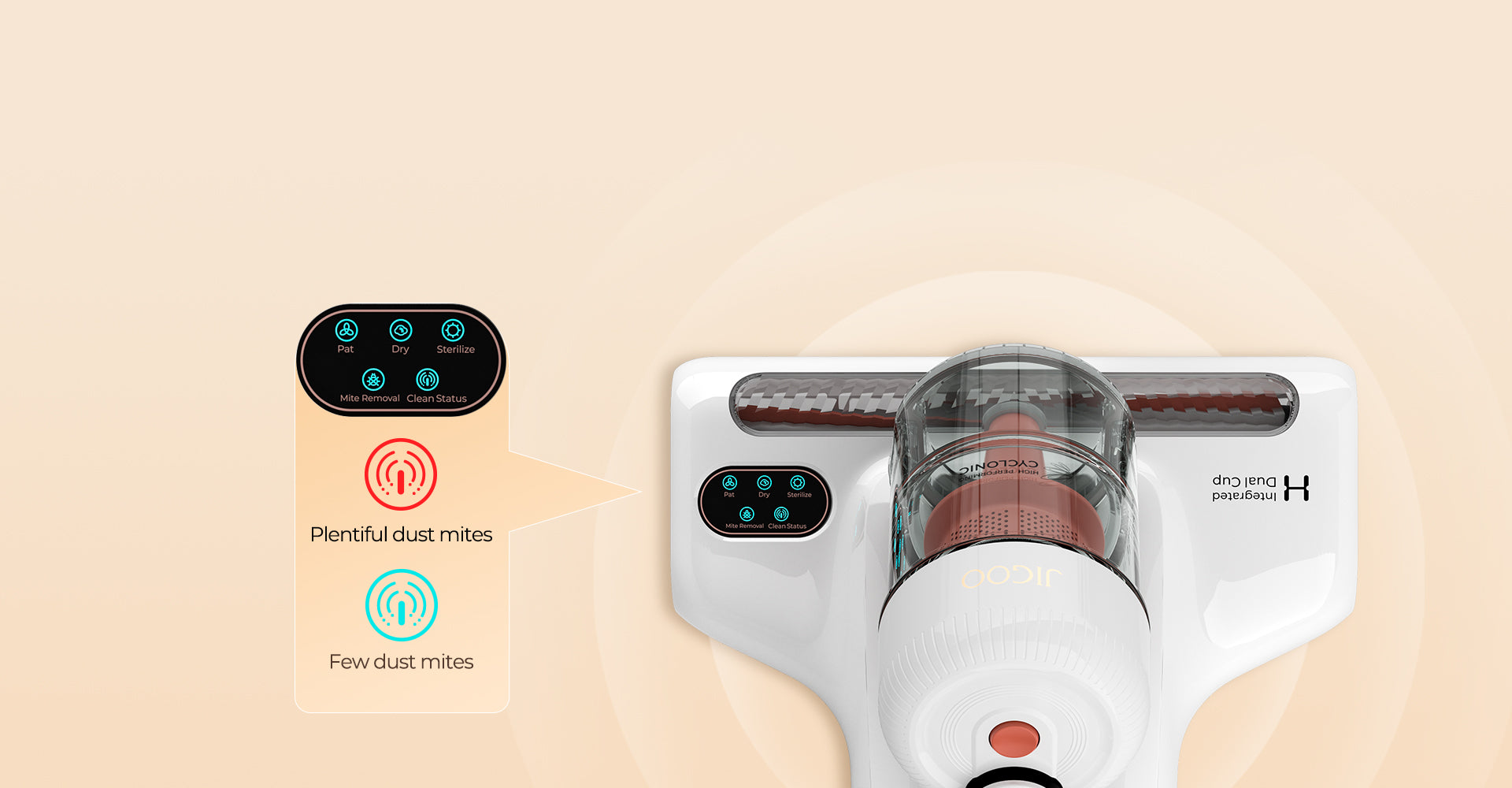 Der JIGOO J200 verfügt über ein integriertes Doppelbehältersystem: Ein Behälter dient der Filterung, der andere der Staubaufnahme. Der Zyklonfilterbehälter filtert effektiv Staubmilben und gibt gleichzeitig saubere Luft ab, wodurch höchste Filtereffizienz erreicht wird. Dieses einzigartige Design minimiert das Risiko von Filterverstopfungen und sorgt so für eine lange Saugdauer. Der geräumige Staubbehälter ist vom Filterbehälter getrennt und bietet ausreichend Aufnahmekapazität. So können Sie Staubmilben auf Bett, Sofa und Teppich gleichzeitig und ohne Unterbrechung bekämpfen.
