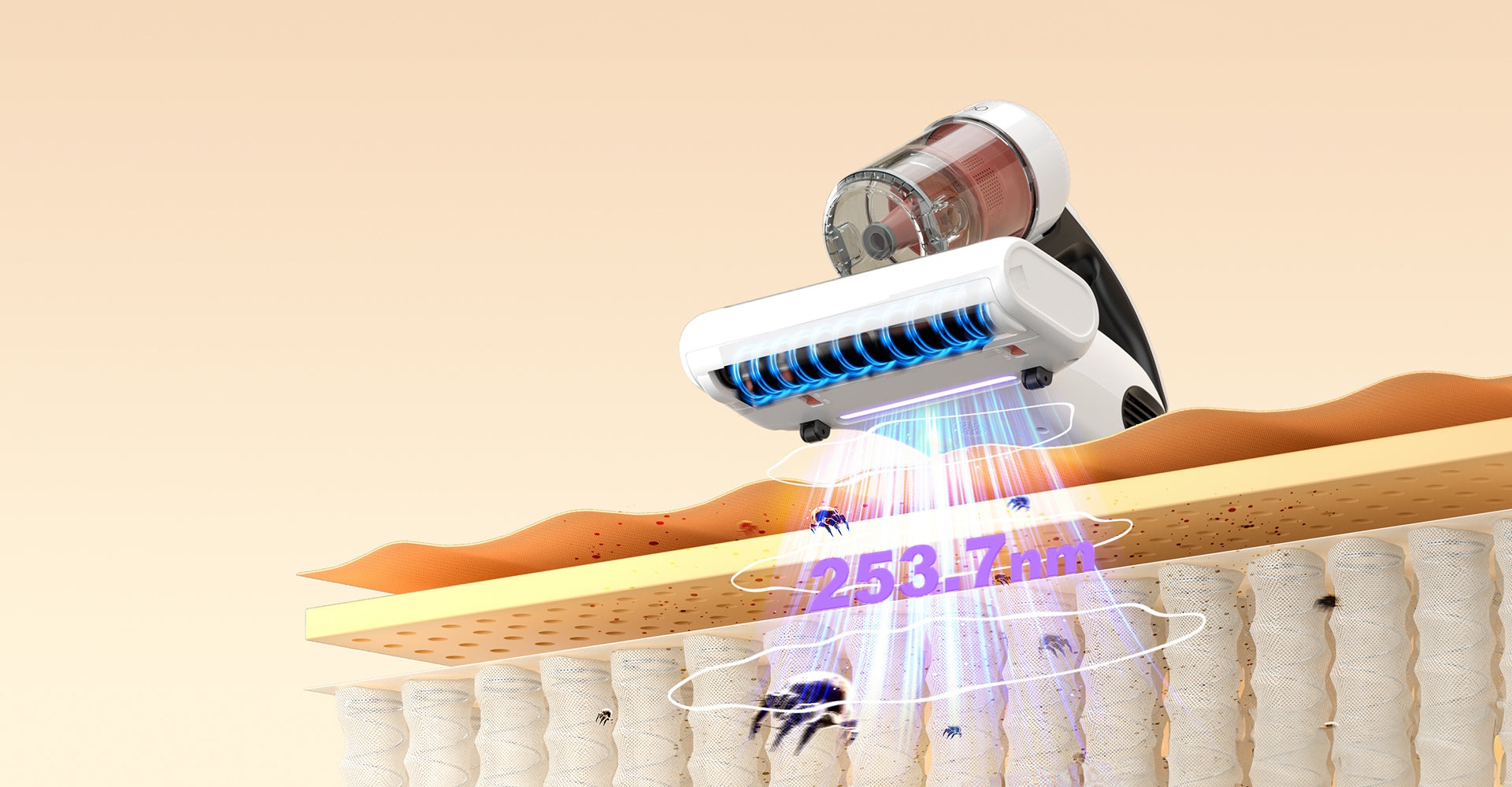 Der JIGOO J200 Milbenstaubsauger strahlt UV-Strahlen mit einer Wellenlänge von 253,7 nm aus und bläst 60 °C heiße Luft, um 99,9 % der in der Matratze lauernden Hausstaubmilben und Bakterien zu entfernen. Das UV-Licht desinfiziert die Textilien und zerstört die DNA und RNA der Hausstaubmilben, während die 60 °C heiße Luft die Milbenaktivität reduziert und Ihre Matratze entfeuchtet, wodurch eine hygienische Schlafumgebung entsteht. Zu Ihrer Sicherheit wird das UV-Licht automatisch ausgeschaltet, wenn die Maschine angehoben wird, um mögliche Augenschäden zu vermeiden.