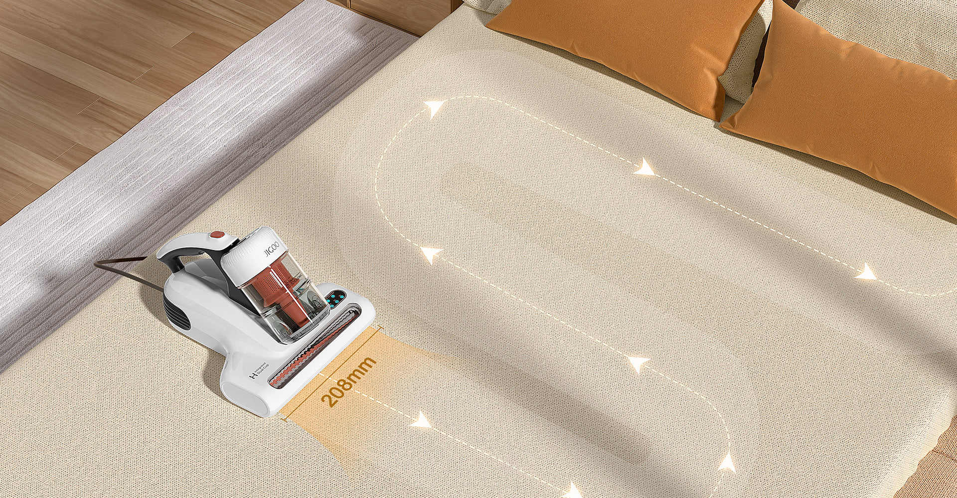 Der Matratzenstaubsauger JIGOO J200 überzeugt dank seines 500-Watt-Motors mit einer starken Saugleistung von 13.000 Pa durch gründliche Tiefenreinigung und hinterlässt keine Rückstände. Von der Matratzenoberfläche bis in die tieferen Schichten entfernt er effektiv alle Hausstaubmilben. Mit seiner 208 mm breiten Saugöffnung reinigt er mühelos große Betten und lange Sofas in wenigen Minuten.