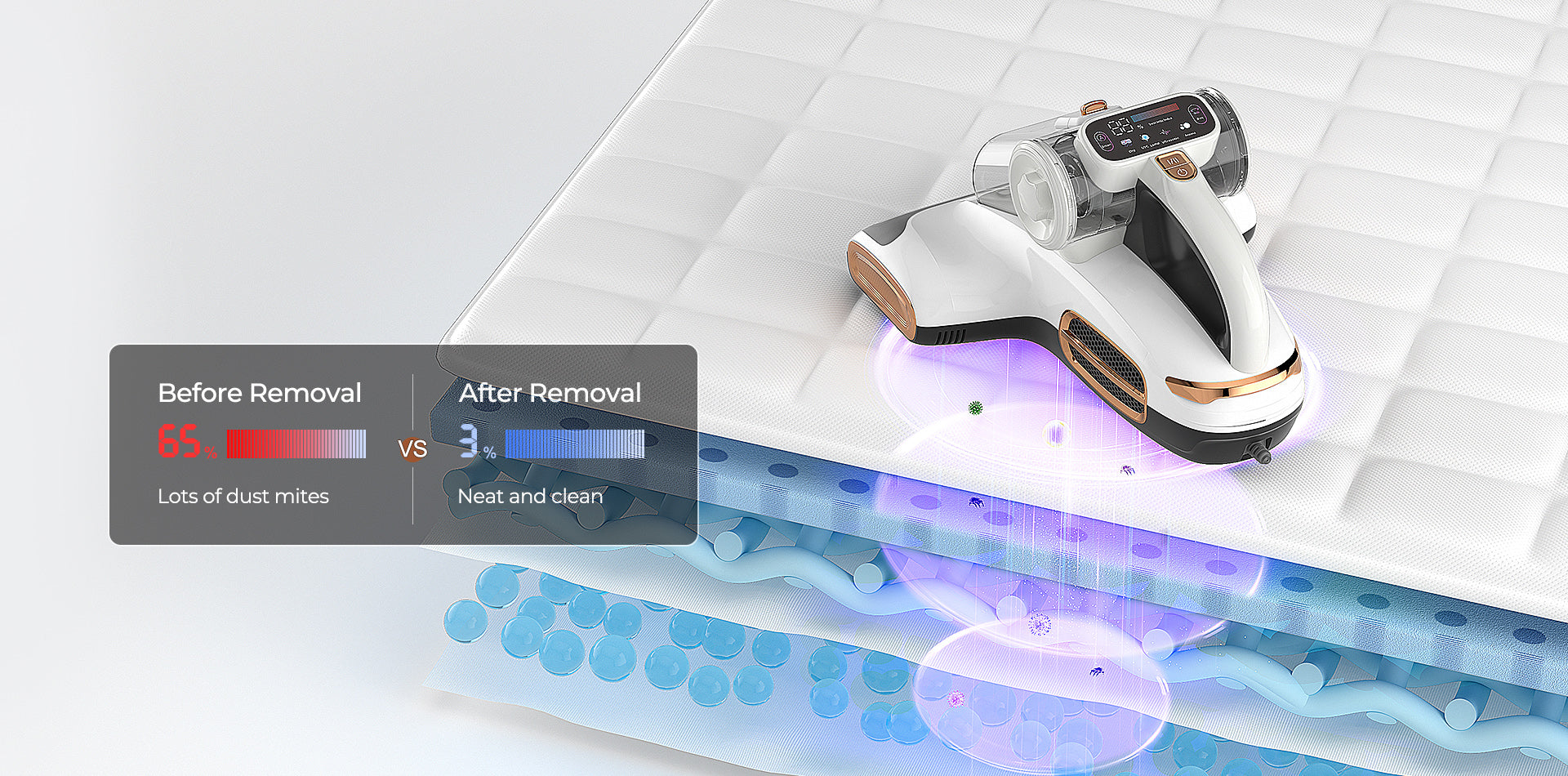 Der JIGOO Matratzenstaubsauger entfernt dank 700 W Leistung und 15 kPa Saugkraft 99,99 % der Milben an der Oberfläche. Die 800-mW-UV-Lampe und konstante 60 °C Hitze durchdringen tiefes Gewebe für radikale Reinigung.