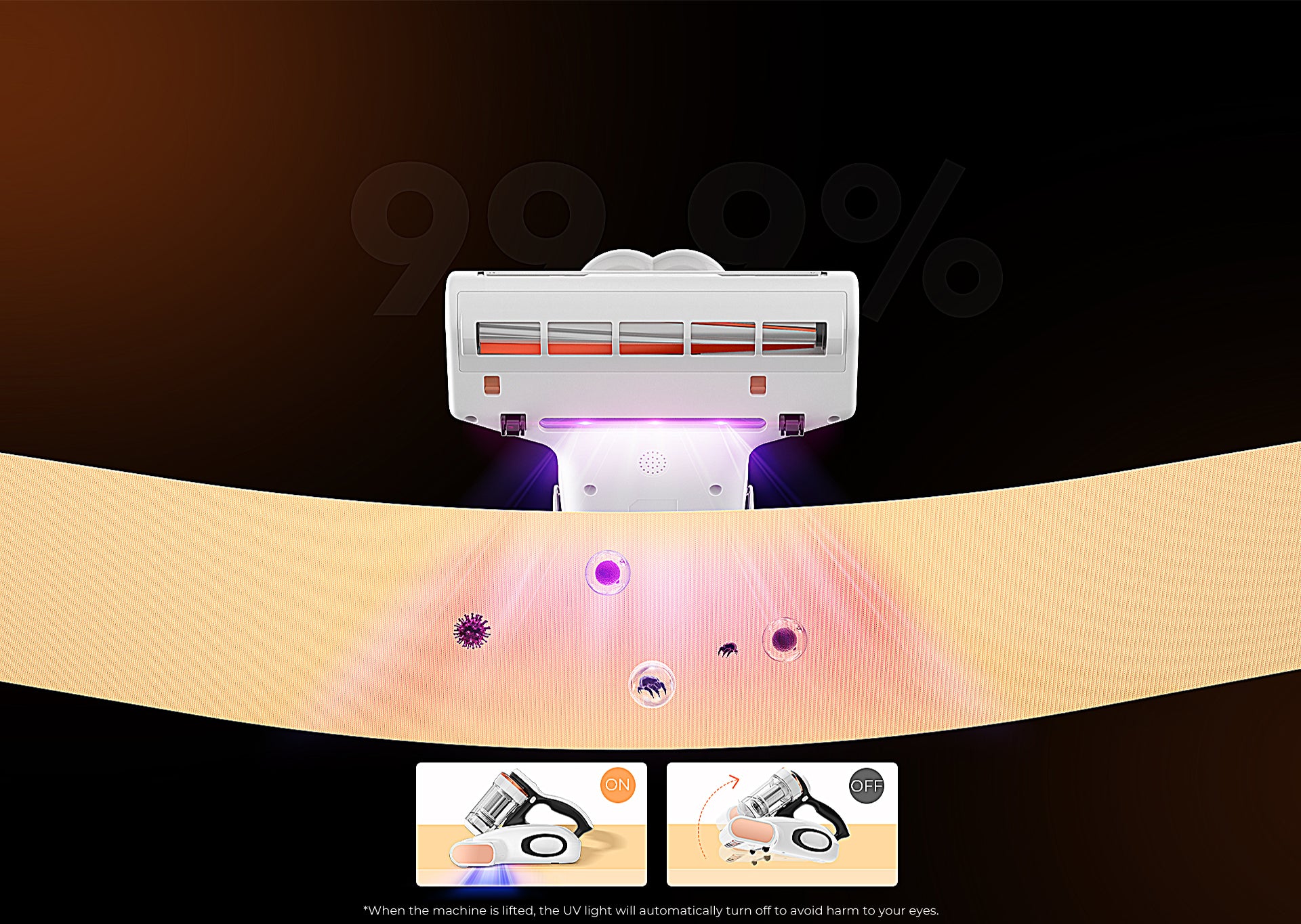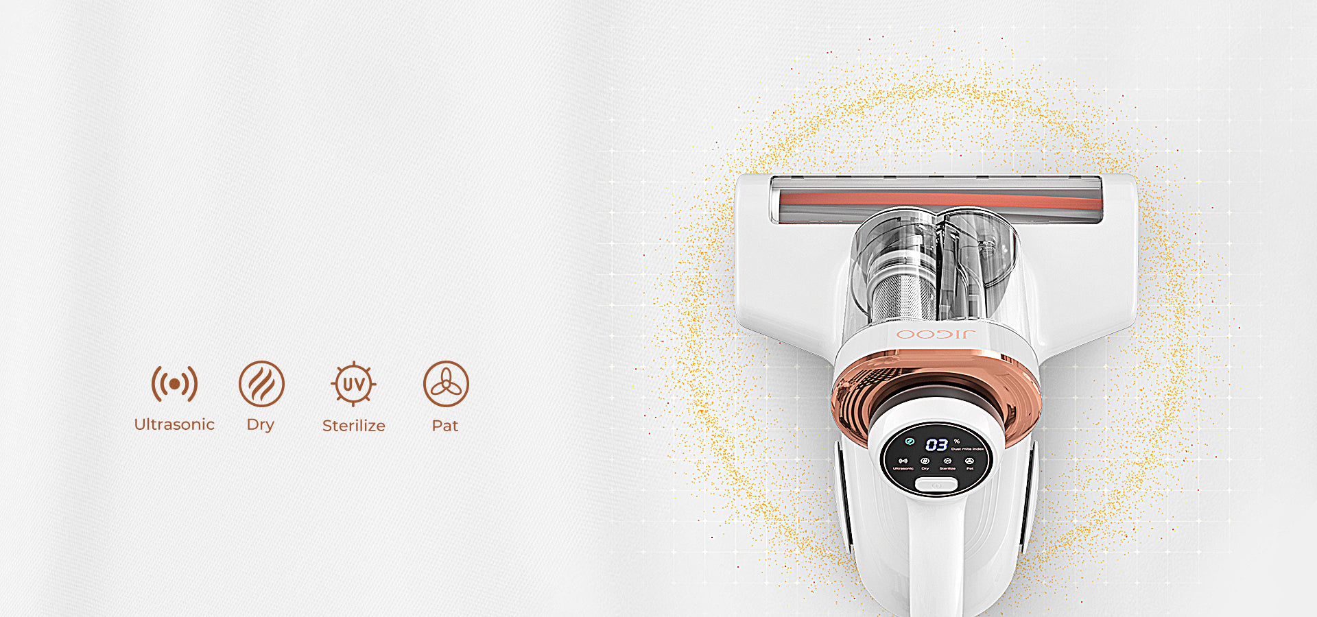 JIGOO J300 rilascia raggi UV a una lunghezza d'onda di 253,7 nm, sradicando senza sforzo le cellule degli acari ed eliminando il 99,9% degli acari e dei batteri che si annidano all'interno del materasso. Nel frattempo, emette onde ultrasoniche per interrompere il sistema nervoso degli acari. Per la tua sicurezza, la luce UV si spegnerà automaticamente quando la macchina viene sollevata per evitare danni agli occhi.
