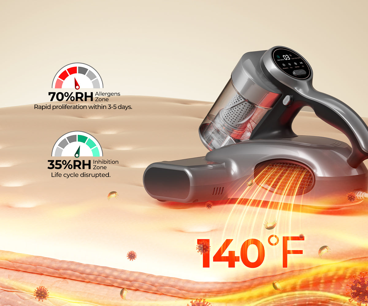 Soffia un flusso costante di aria calda a 140 °F per sopprimere efficacemente l'attività degli acari della polvere e rimuovere l'umidità dai materassi.