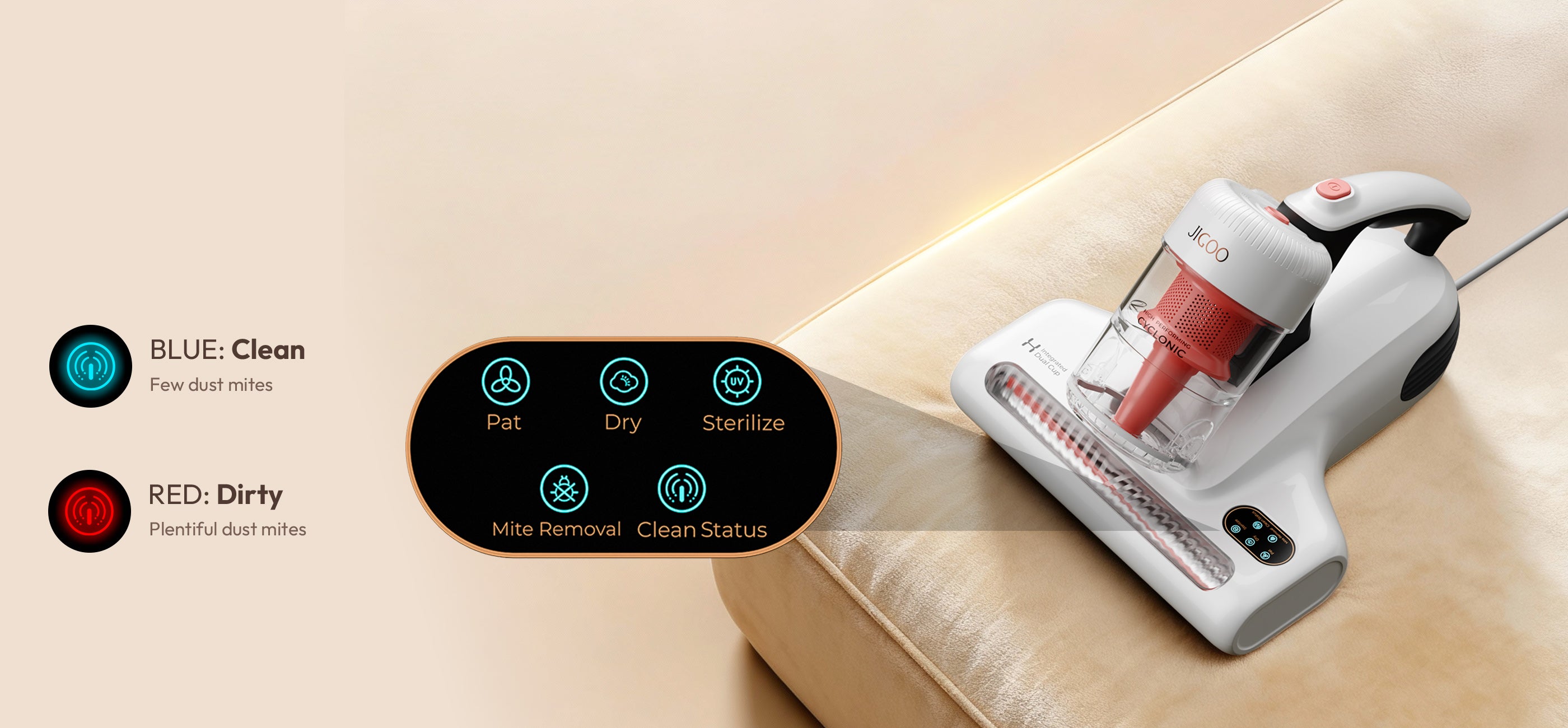 It features a clear LED display where you can monitor the real-time status of dust mites. The built-in sensor smartly detects dust mites on your mattress, and the status indicator automatically turns blue when the cleaning is completed.