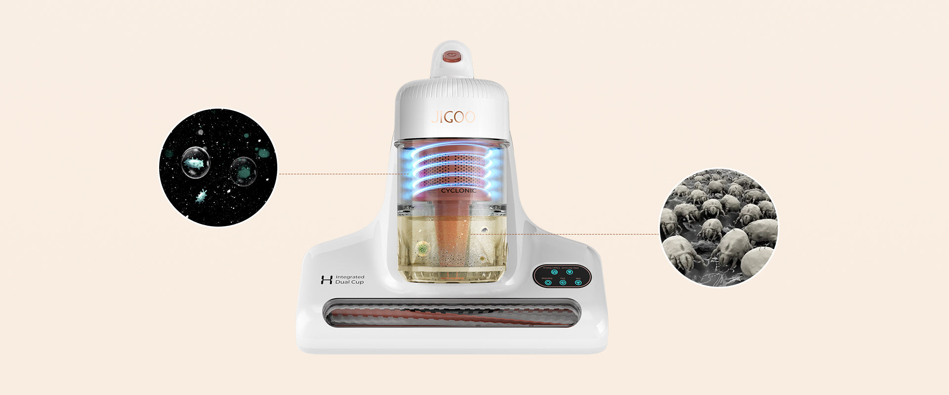 The JIGOO J200 incorporates an integrated dual-cup system, with one cup dedicated to filtration and the other to dust storage. The cyclone filter cup effectively filters dust mites while releasing clean air, achieving the highest filtration efficiency. This unique design minimizes the risk of filter clogs for an extended period of robust suction. The spacious dust cup is separated from the filter cup and offers ample storage capacity, enabling you to tackle dust mites on your bed, sofa, and carpet all at once without interruption.